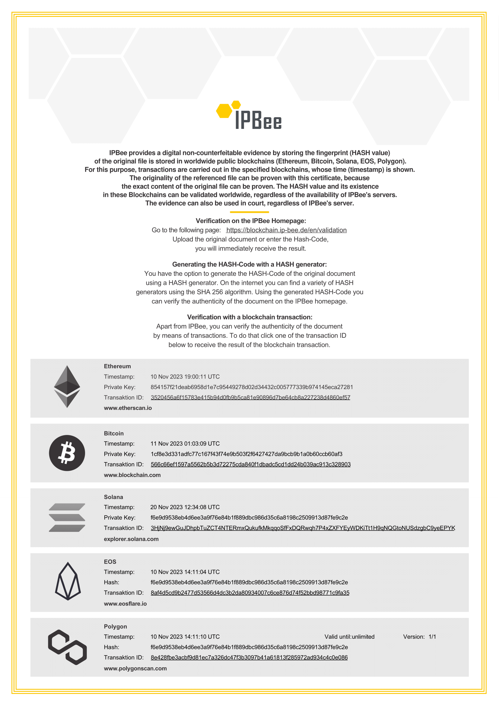After completion of the process, you will receive a certificate from IPBee, which contains a description, all essential information about the original file (if available), the transactions and storage in the different blockchains as well as a brief instruction of the verification.